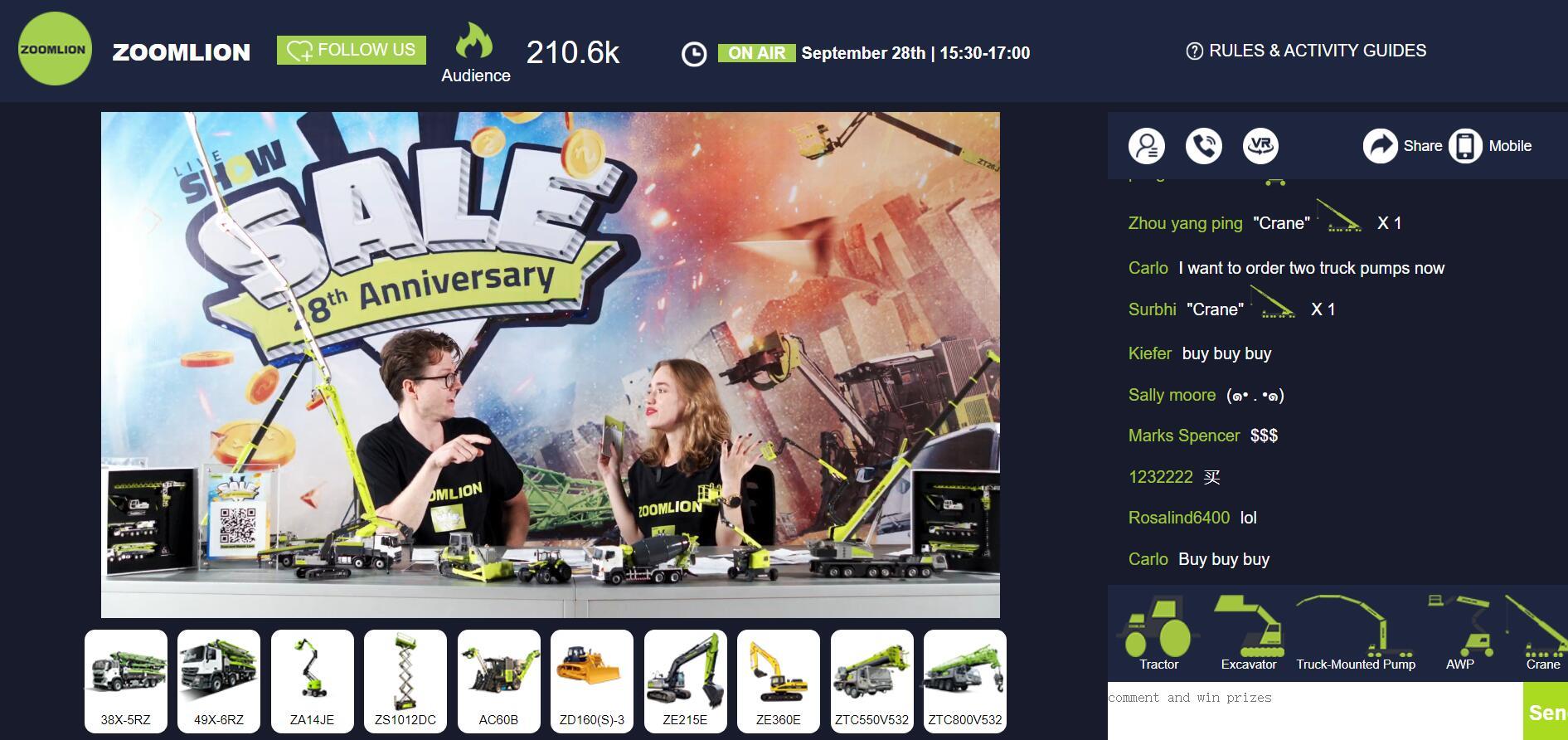 9月28日下午,中联重科“928海外嗨购节”盛大举行,活动吸引了来自全球各地的客户、代理商观摩,在线观众数量突破23万,并以2.06亿元的带货成果为海外直播写下了良好的开篇。