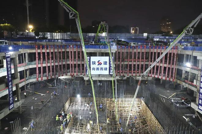 该项目基坑深度近20米,筏板**厚处为7.55米,整个基础底板浇筑工程采用多点同时浇筑,从中心向四周,由深到浅,斜面分层施工,整体一次完成浇筑。为应对跨昼夜深基坑连续作业,项目方经过多方对比,**终选择中联重科设备承担重任。