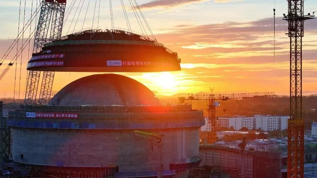 “准备起吊”!伴随着现场吊装总指挥的一声令下,10月18日,总重量约为600吨的昌江核电二期3号机组超大型外穹顶模块,在中联重科3200吨履带起重机的吊装下安全而平稳地落在核岛顶部,为核电机组勾勒出了雄伟的轮廓,也标志着核岛主体结构施工已基本完成,为接下来的安装调试及并网发电奠定了坚实的基础。