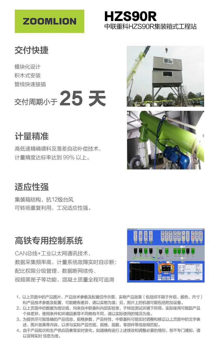 中联重科系列4.0混凝土搅拌站的配置具有搅拌性能优良、计量精确稳定、可靠性高、保养维修方便、高环保性能、模块化程度高等特点,市场口碑好,市场占有率高,是混凝土施工及商品混凝土生产的理想和首选设备。